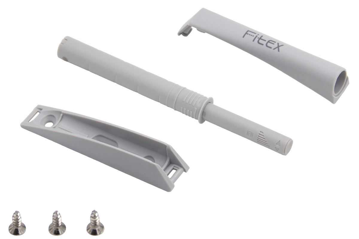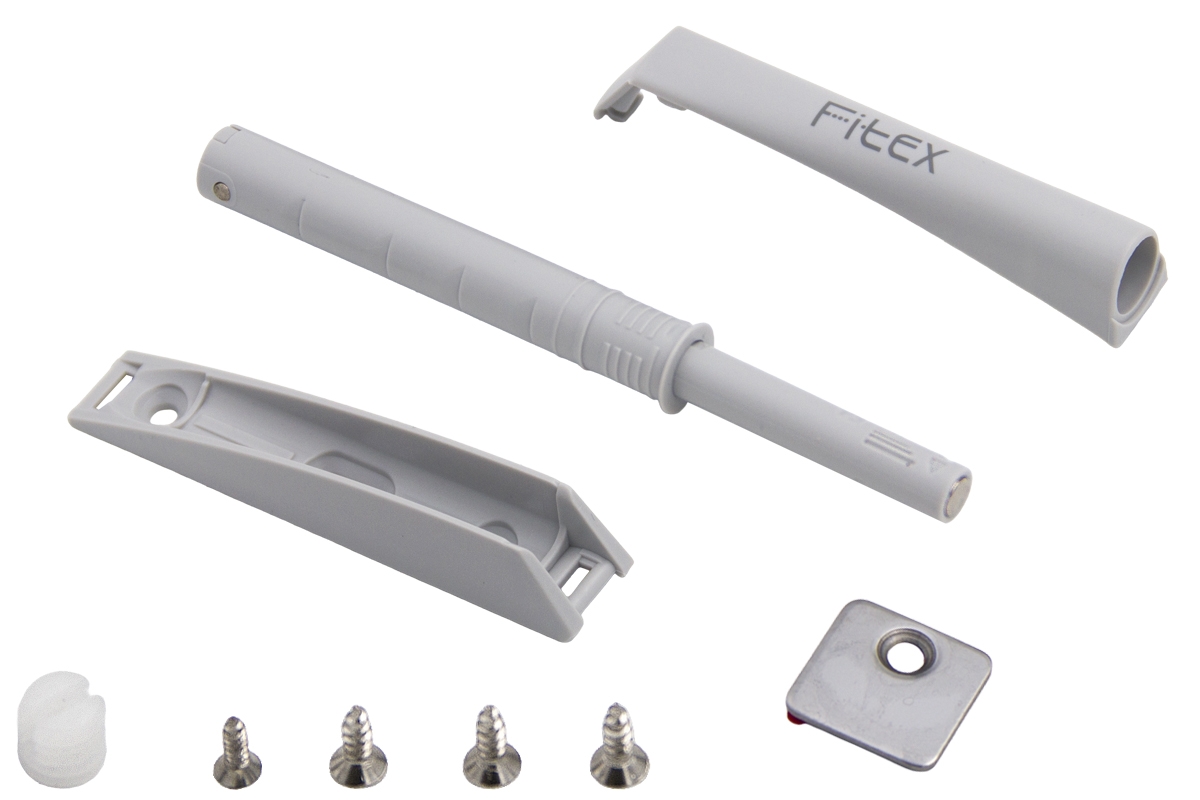 Универсальный толкатель Fitex, ход 37 мм Для мебели с обычными самозакрывающимися петлями. Полимерный наконечник, мощная пружина 35 Н и полный монтажный комплект.